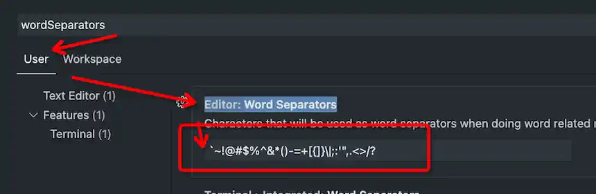 wordSeparators - 删除 Editor: Word Separators 下面输入框中的 - 号